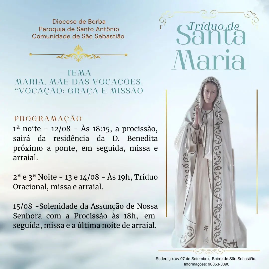 Em sintonia com o tema do Ano Vocacional 2023, “Vocação: Graça e Missão”, a Comunidade de São Sebastião, inicia neste sábado (12/8), a partir das 18h15 o Tríduo em honra a Santa Maria, com a procissão saindo da residência da sra. Benedita de Góes, na Av. 7 de setembro, próximo a ponte.