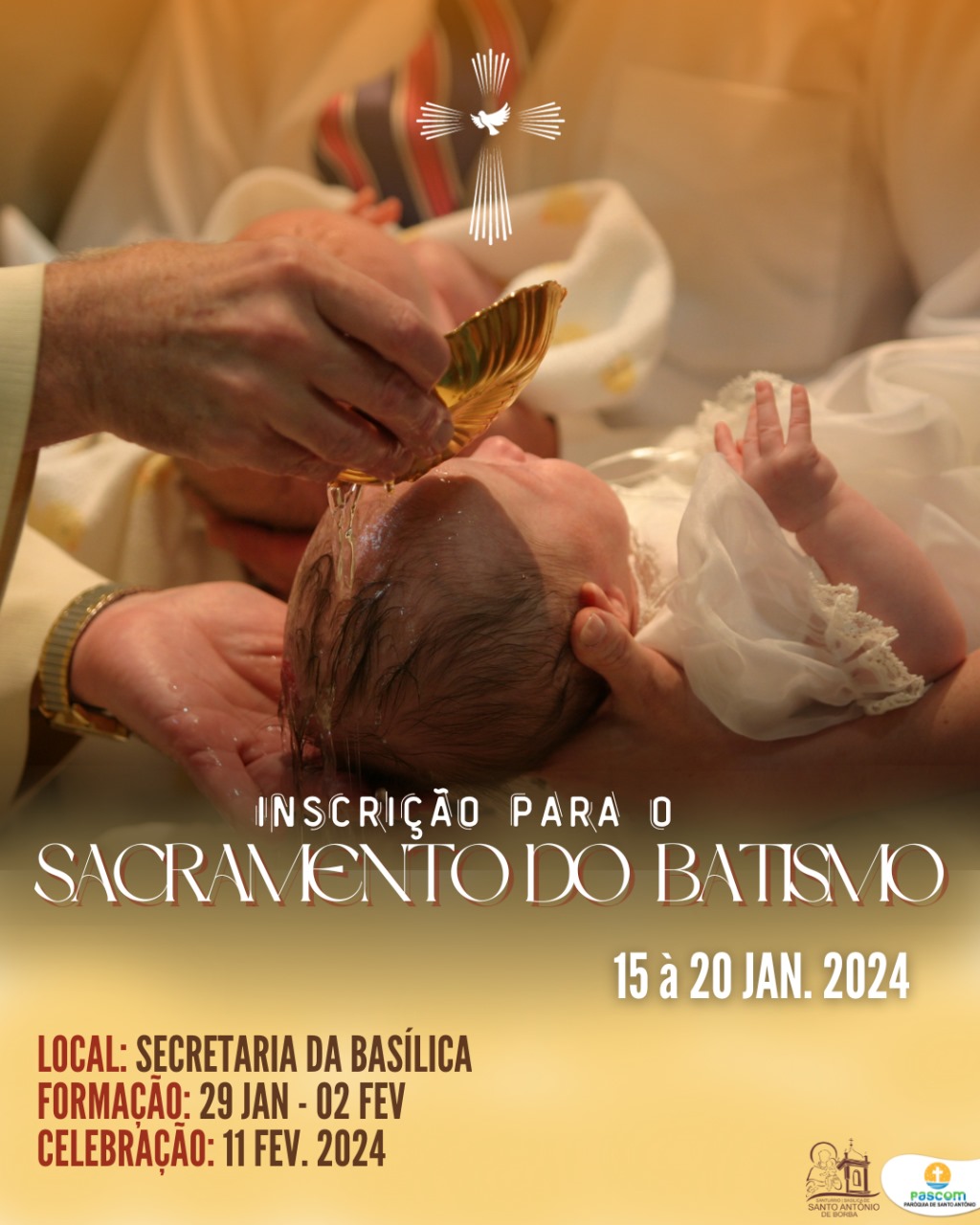 ✨ Dia 15 de Janeiro 2024 deu-se início à inscrição do Sacramento do Batismo. A celebração acontecerá no dia 11 de fevereiro de 2024.